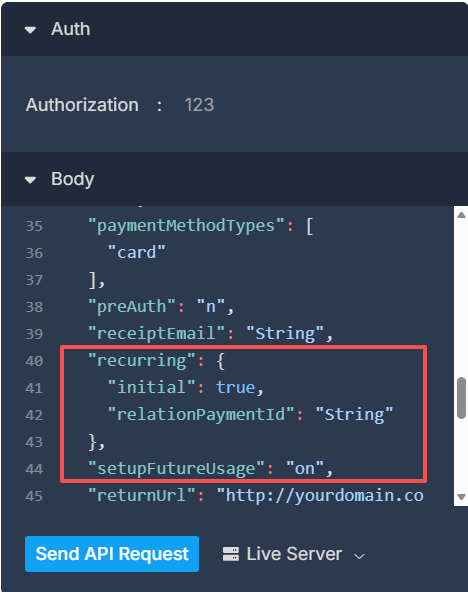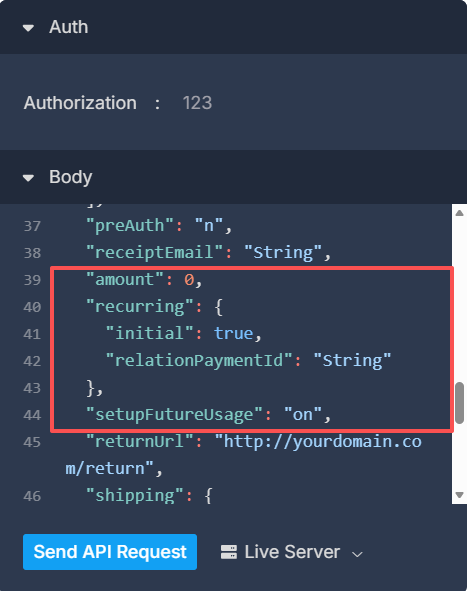 When creating the initial recurring transaction, set the transaction field <mark style="color:$primary;">`amount`</mark> to **0** to indicate that this is an authorization request rather than a charge.the <mark style="color:blue;">`setupFutureUsage`</mark> must be set to `on`.