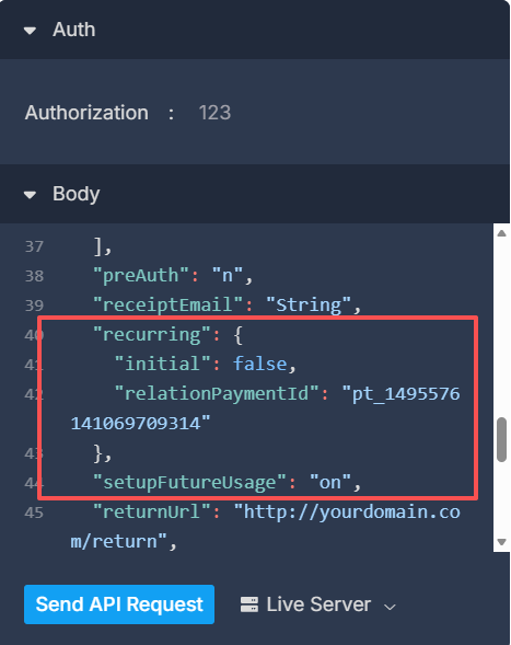 For the subsequent transaction of a rebilling cycle, the <mark style="color:blue;">`initial`</mark> can be `null` or set to be `false` , the <mark style="color:blue;">`relationPaymentId`</mark> must be the `Payment ID`of its initial payment, and <mark style="color:blue;">`setupFutureUsage`</mark> must be set to `on`.