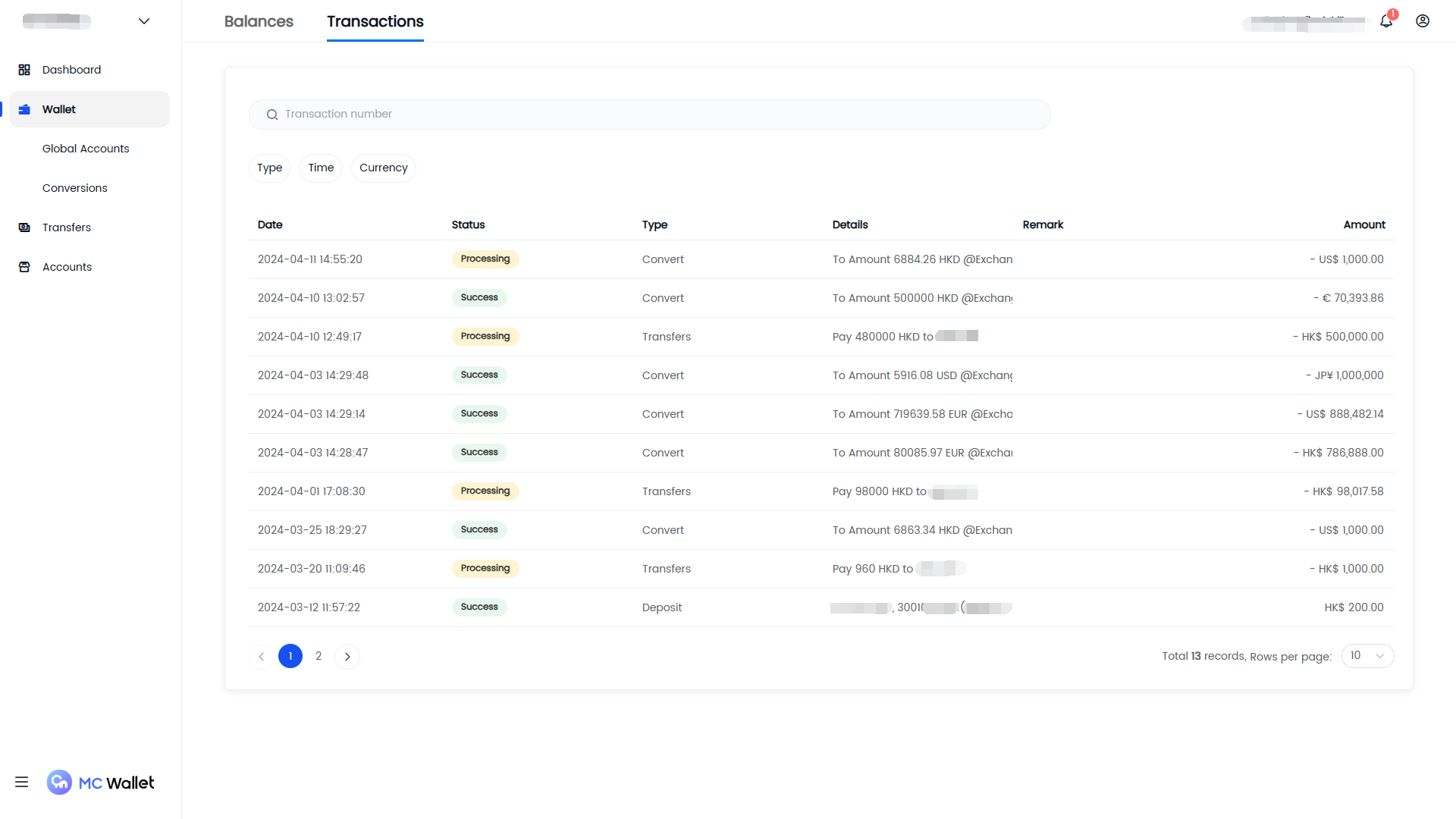 All transactions affecting the account balance, including[ deposits](#global-collection-account), [withdrawals](#transfer-payments), and [currency exchanges](#conversion), will be displayed here.